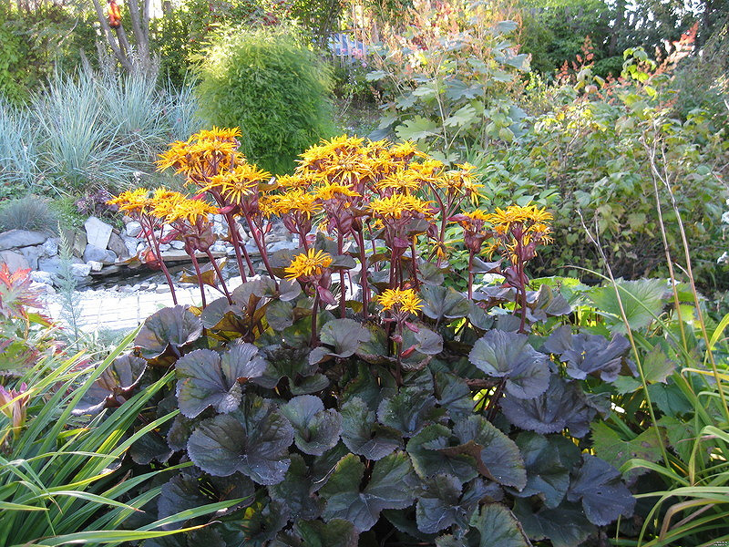 - обладает отменным адаптационным потенциалом. Выращивание из семян бузульника зубчатого Миднайт Леди под силу любому цветоводу, так как этот сорт не привередлив. Используют данную культуру, как в групповых композициях (на заднем плане), так и солитерно. Эффектно смотрится в прибрежных миксбордерах.