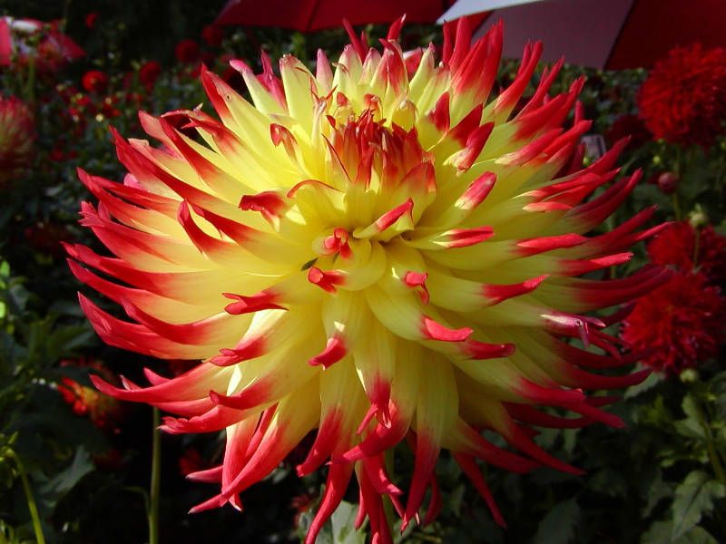 Луковицы георгины махровой Jessica (Dáhlia variabilis) порадуют яркой окраской цветов, а также длительным цветением. Высота взрослых кустов варьируется от 60 до 140 сантиметров. В июле распускаются крупные цветы с желтыми лепестками, кончики которых имеют ярко-красную окраску. Цветение длится до сентябрьских ночных заморозков. Этот сорт можно выращивать для срезки и последующего составления роскошных букетов. Луковицы георгины Jessica широко используются при оформлении ландшафта загородных участков. Эффектные кусты можно размещать вдоль садовых дорожек, заборов или стен сооружений. Летом цветы источают приятный тропический аромат, поэтому их также можно высаживать возле мест, предназначенных для отдыха.