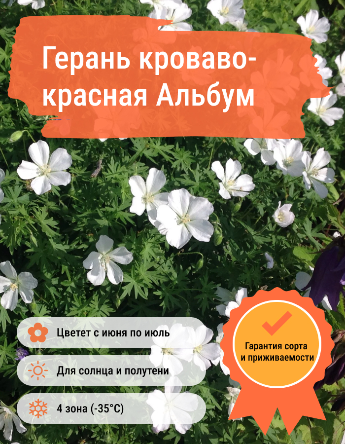 Саженцы герани кроваво-красной Альбум (Geranium sanquineum Album) разрастаясь, образуют пышные кустики красивой сферической формы, усыпанной нежными белыми цветочками. Растение достигает в высоту от 20 до 30 сантиметров, в ширину до 50 сантиметров. В осенний период листья и стебли приобретают ярко-красный оттенок. Цветочки белые, с прожилками, диаметром 2-3,5 сантиметров. И листья, и цветы обладают ярким характерным ароматом. Сорт устойчивый, хорошо переносит суровые зимы и засуху, практически не подвержен болезням и поражениям вредителями. На одном месте может расти до 15 лет.