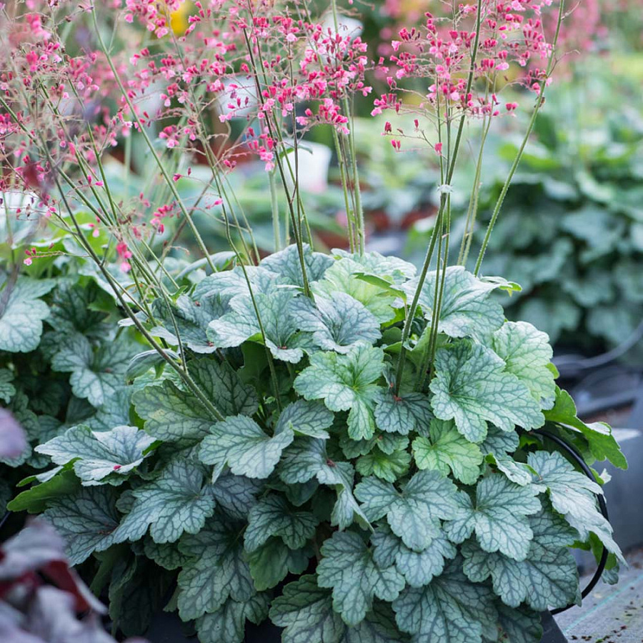Рассада гейхеры Пепперминт Спайс (Peppermint Spice) станет достойным экспонатом смешанных посадок, альпийских горок или бордюров. Многолетник цветет розовыми соцветиями на протяжении всего лета. Серебристо-зеленая листва с темными прожилками сохраняет эффектный вид с ранней весны до поздней осени.