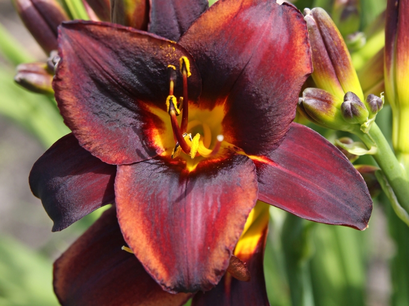 Окраска цветка : Шоколадно-бордовая с желтым горлом