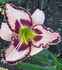 Окраска цветка : кремово-розовый с лиловым пятном и каймой, горло зелёно