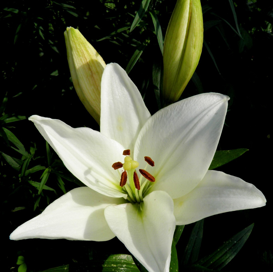 Окраска цветка : Высоко рентабельная чисто-белая лилия. Крапа нет, в горле слегка зеленоватая. Пыльники коричневые, рыльце светлое, плотная фактура лепестков