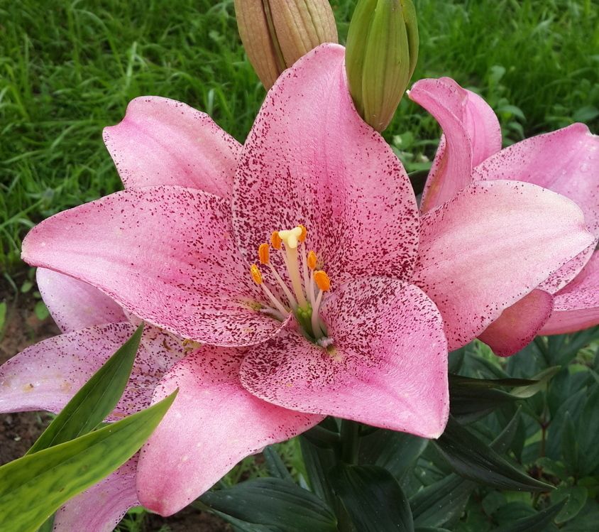 Окраска цветка : крупный, нежно-розовый с сиреневым оттенком и густым темно-розовым крапом