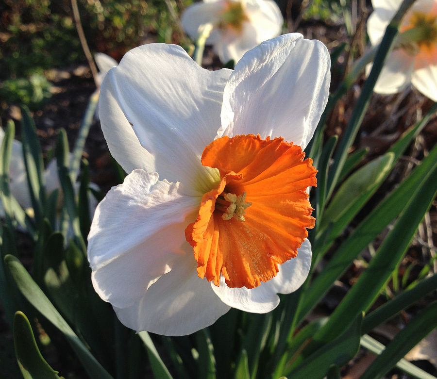 Окраска цветка : лепестки цветка жемчужно-белые с крупной плоской короной насыщенно-оранжевого оттенка
