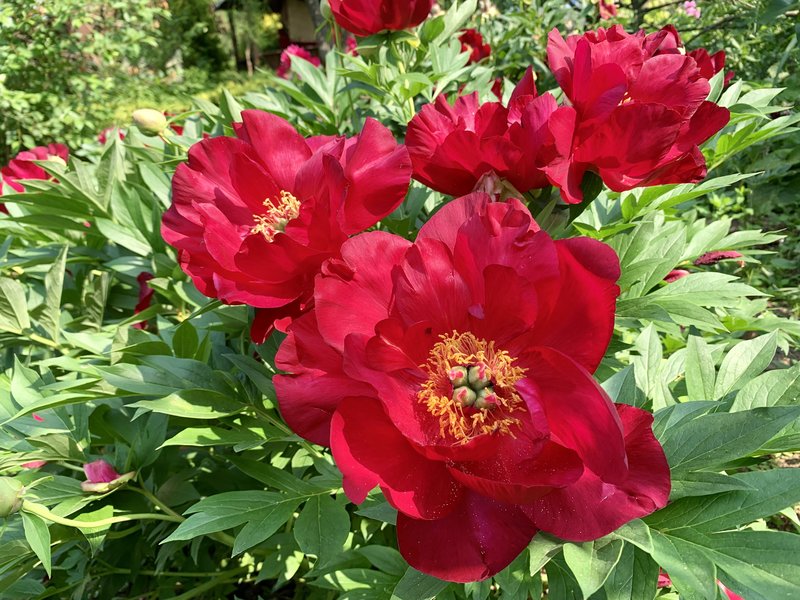 Рассада пиона ИТО Скарлет Хевэн (Scarlet Heaven): великолепный гибридный сорт с насыщенными темно-вишневыми цветами. Особый контраст соцветиям добавляют желтые пыльники. Лепестки переливаются и сияют, как рубины. Растение имеет форму раскидистого куста, высотой 80 см. Густая зеленая листва плотно расположена на прочных побегах. Сорт может размножаться делением, черенками и семенами. Особенности пиона Скарлет Хевэн: